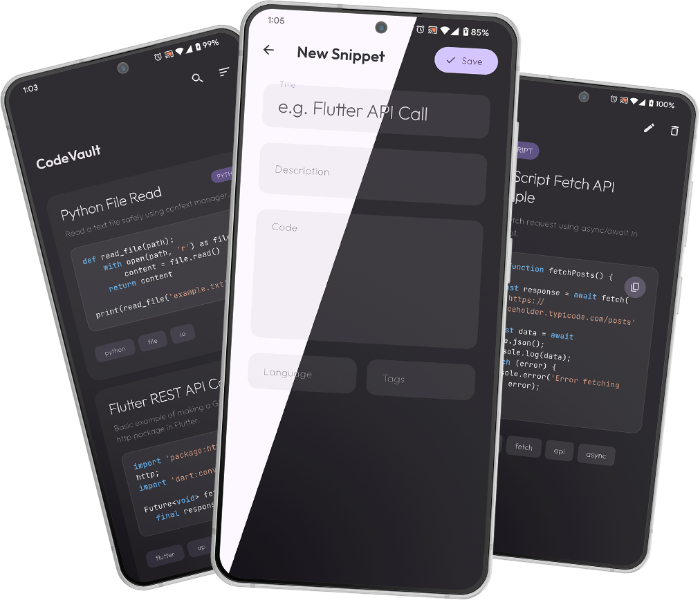 CodeVault is a clean and simple code notebook app designed to help developers save, organize, and edit their code snippets easily.